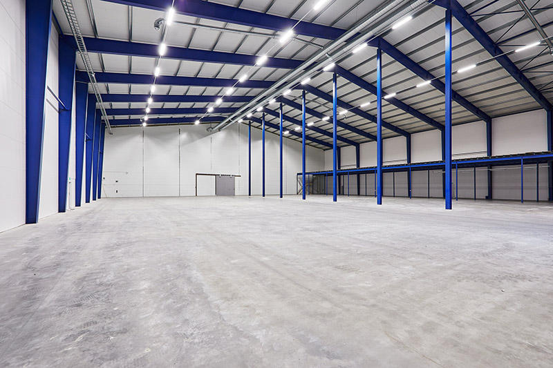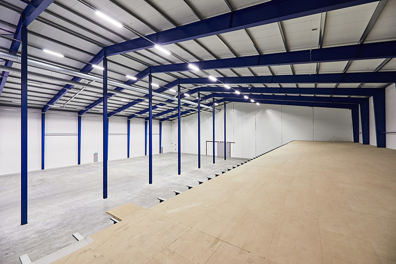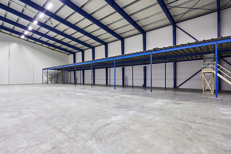 Stor yta med högt till tak och längs ena långsidan finns det en ”övervåning” för ytterligare möjlighet till förvaring.
